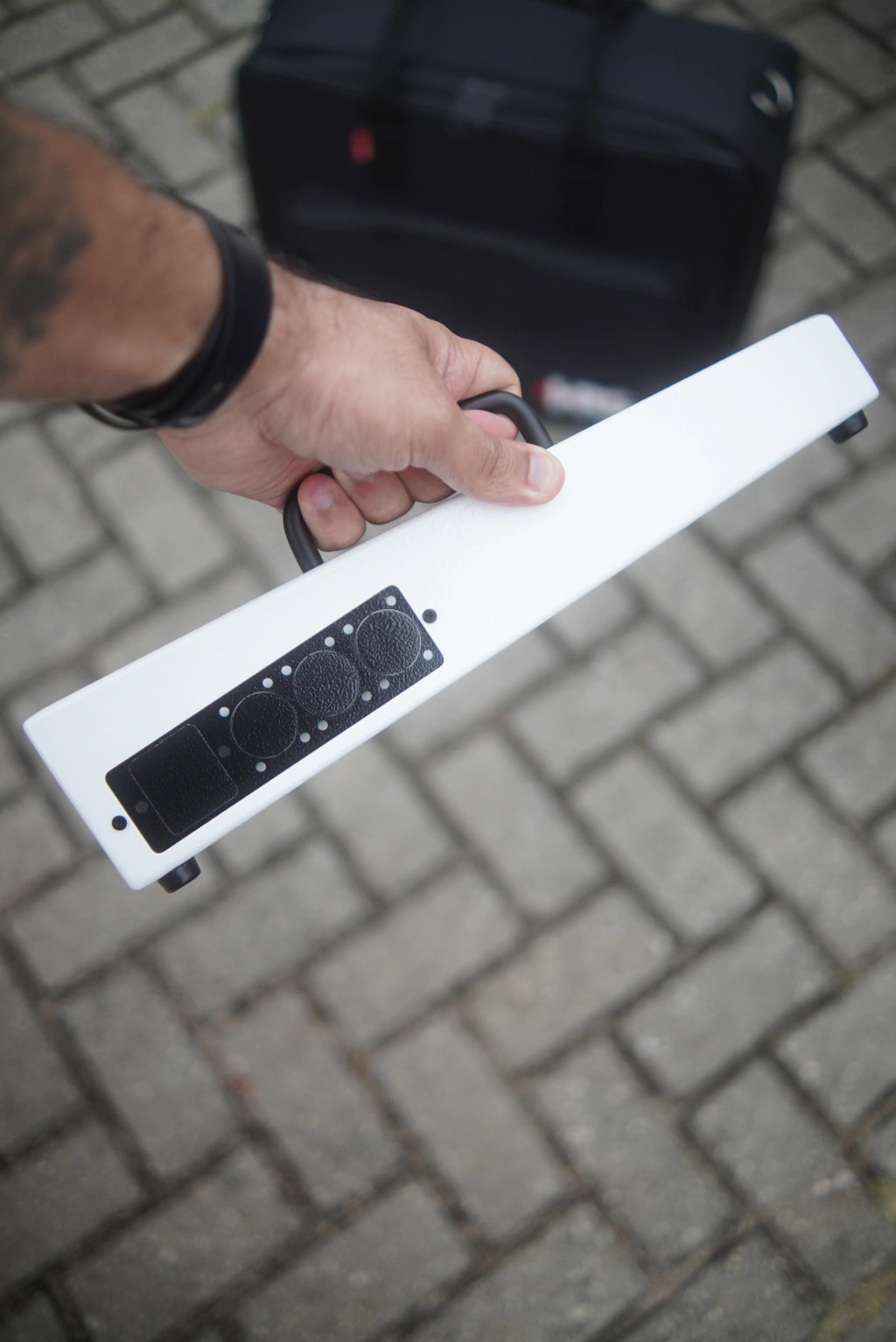 Pedalboard com grau de elevação, fundo "aberto", composto por 1 base e 2 laterais feitas de alumínio com pintura eletrostática; Modelo modular onde permite o cliente escolher o lado onde quer a parte elétrica. Possibilidade de colocar até 6 conectores (3 em cada lateral);
