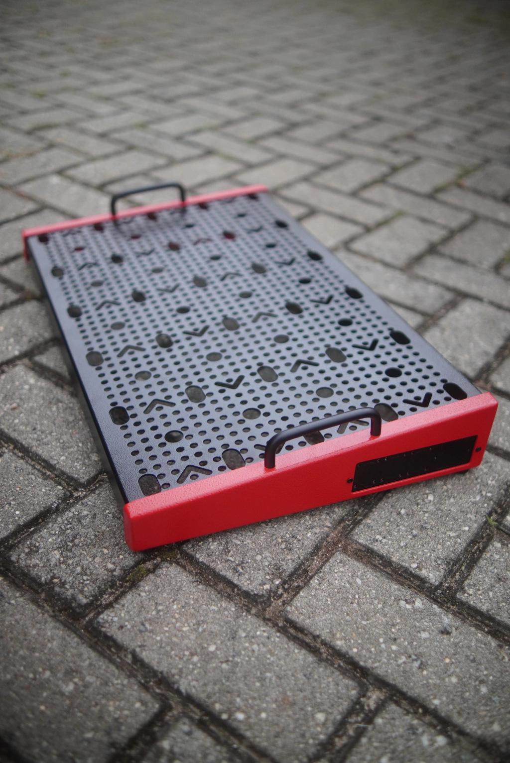 Pedalboard com grau de elevação, fundo "aberto", composto por 1 base e 2 laterais feitas de alumínio com pintura eletrostática; Modelo modular onde permite o cliente escolher o lado onde quer a parte elétrica. Possibilidade de colocar até 6 conectores (3 em cada lateral);