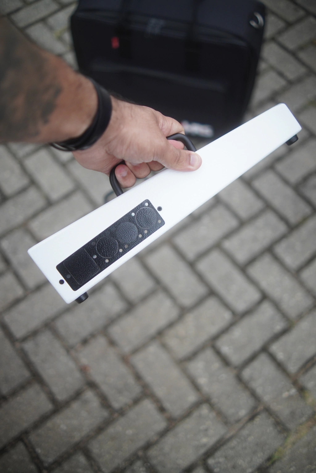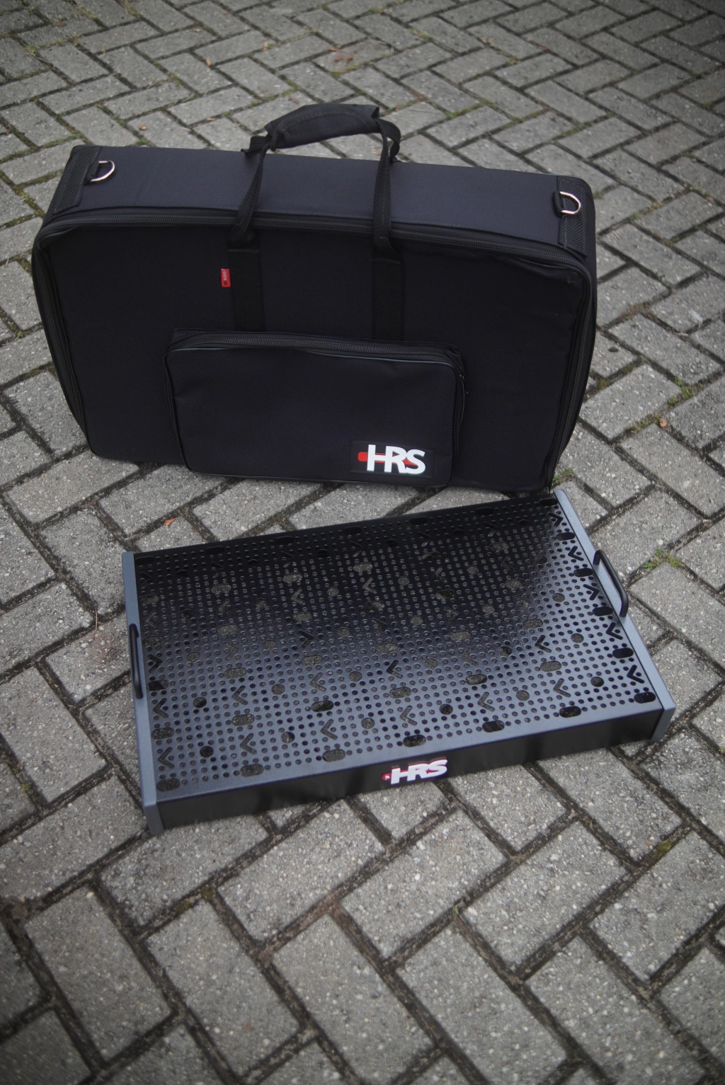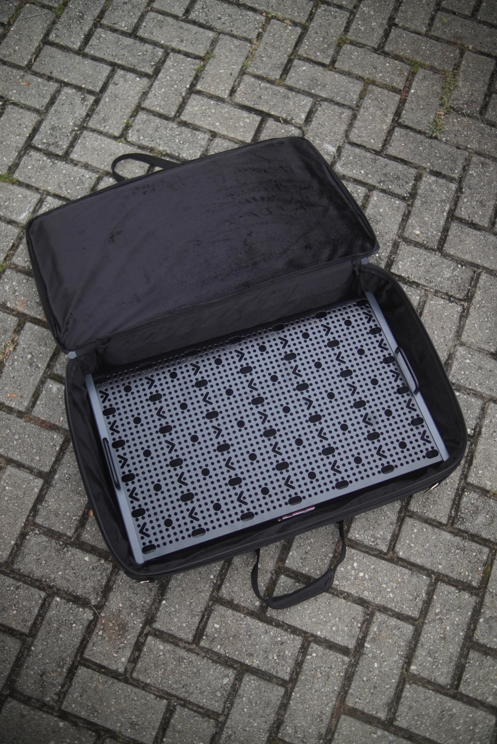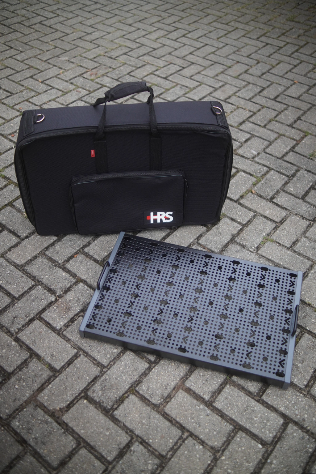 Pedalboard com grau de elevação, fundo "aberto", composto por 1 base e 2 laterais feitas de alumínio com pintura eletrostática; Modelo modular onde permite o cliente escolher o lado onde quer a parte elétrica. Possibilidade de colocar até 6 conectores (3 em cada lateral);